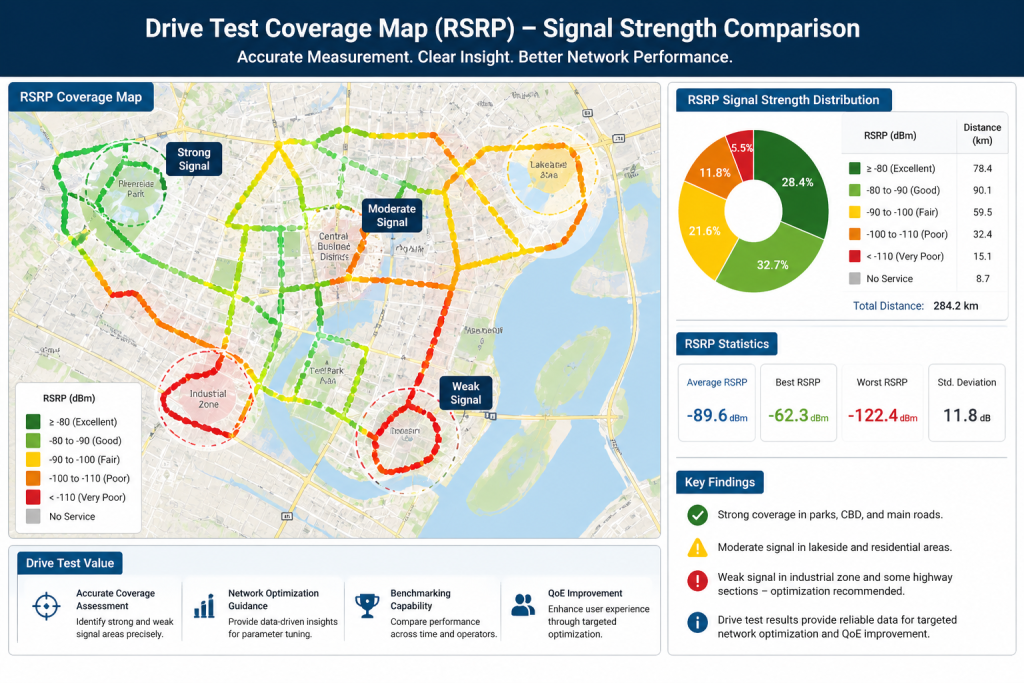 Drive testing enables operators to identify weak coverage areas, handover issues, and signal inconsistencies across diverse environments.